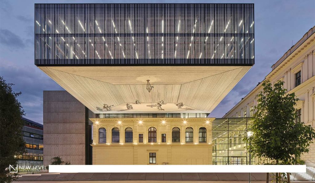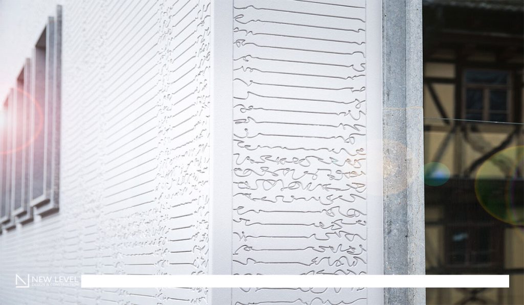 بخش الحاق (گسترش ساختمان) با زبان معماری مدرن از ساختمان قدیمی متمایز شده است، اما همزمان جزئی طبیعی و یکپارچه از توپوگرافی موجود محسوب میشود. برای ایجاد تمایز بین این دو عنصر، از گچ نما سفارشی استفاده شد که فاقد سیمان، مقاوم در برابر آب و شرایط جوی است و امکان ایجاد بافت سطحی متمایز با مزایای کاربردی را فراهم میکند.