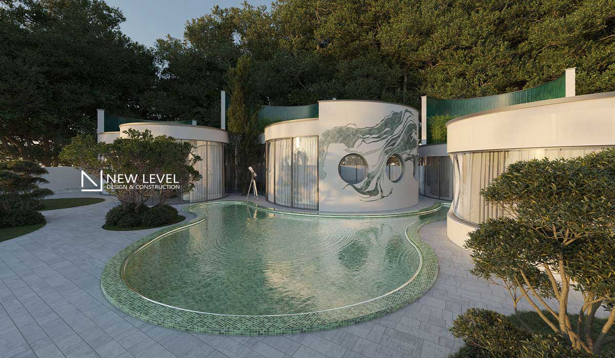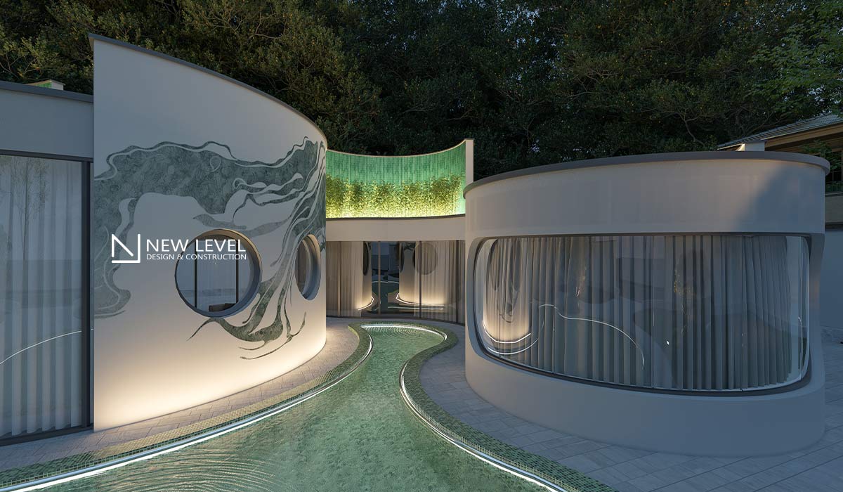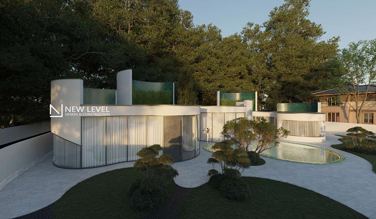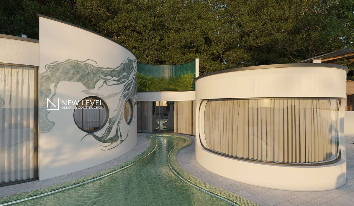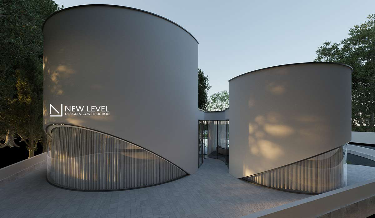 حجم دوم، که شامل اتاق خوابها و استخر است، به صورت معلق طراحی شده است. این انتخاب، علاوه بر ایجاد حس سبکی و شناوری در معماری، فضایی مدرن و منحصربهفرد به نما بخشیده است. حجم سوم که به آشپزخانه و فضای ناهارخوری اختصاص دارد، بهگونهای قرار گرفته که امکان دسترسی آسان به محیطهای داخلی و بیرونی را فراهم کند. این ترکیب احجام، فضایی پویا و چند لایه ایجاد کرده که زیبایی بصری و عملکردی را بهطور هم زمان ارائه میدهد.