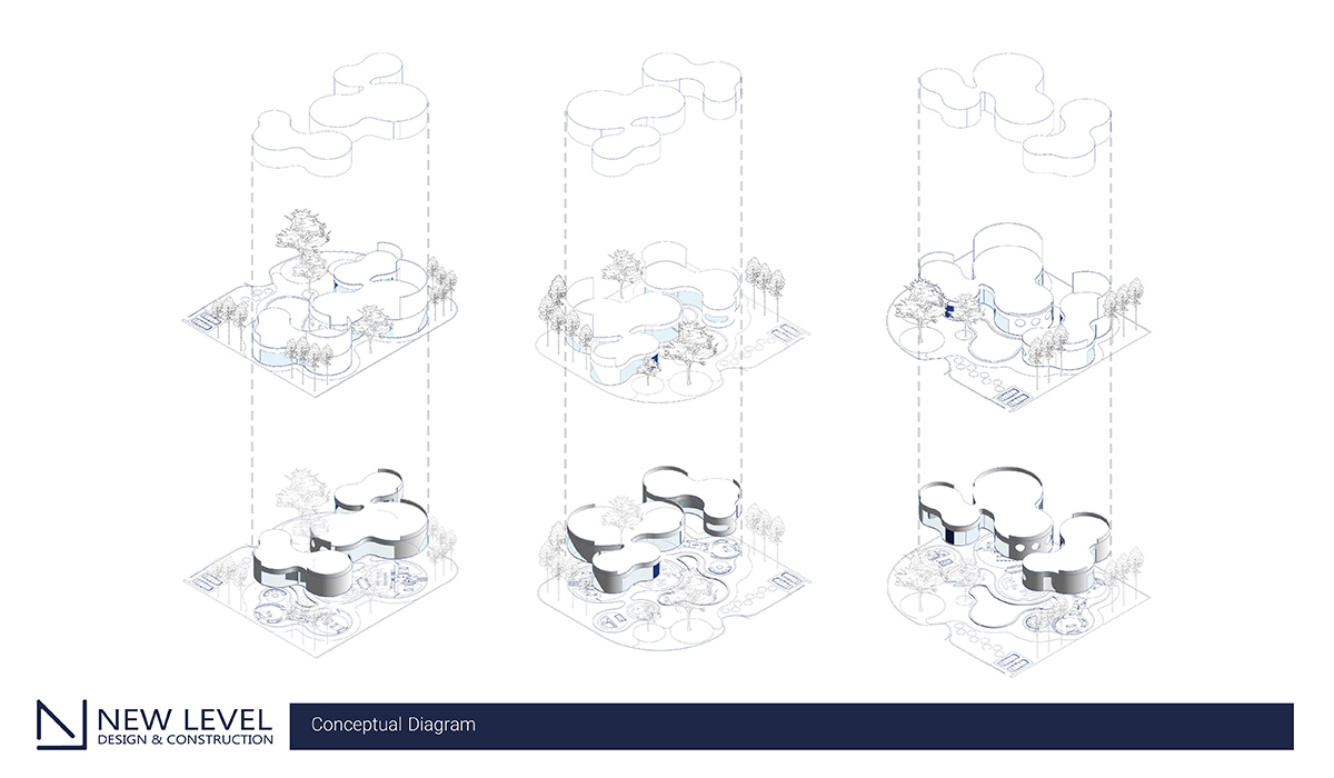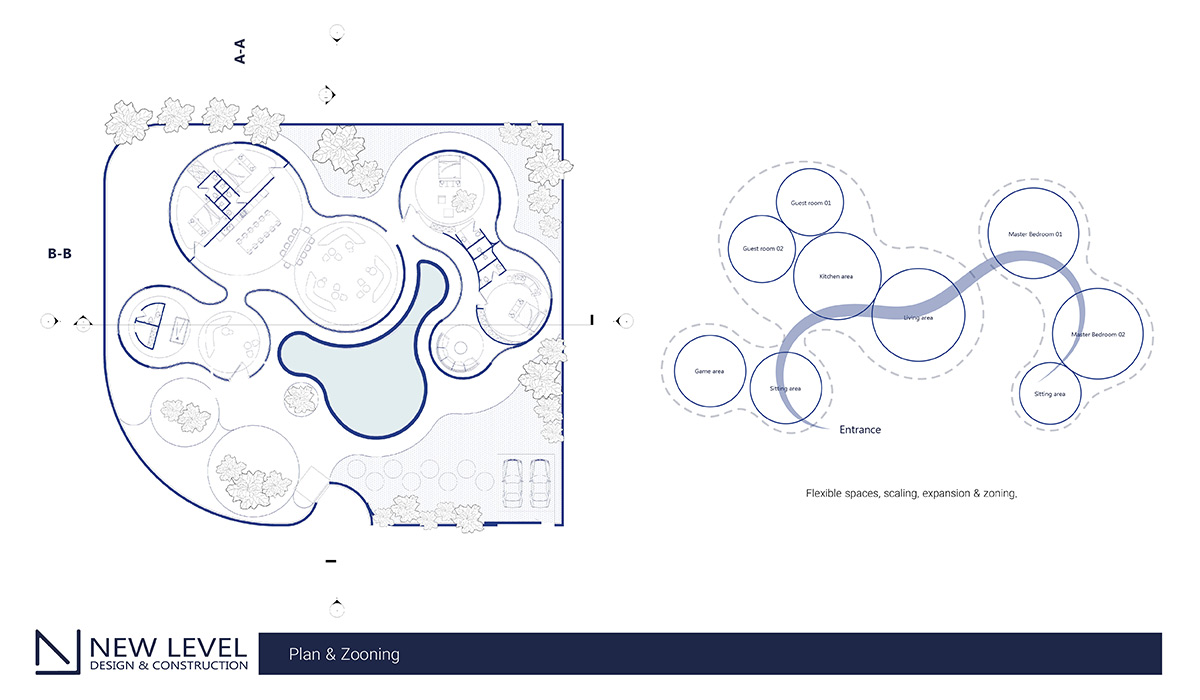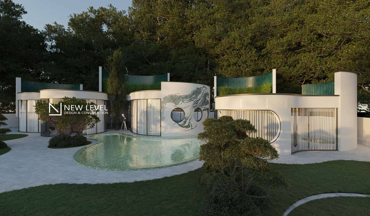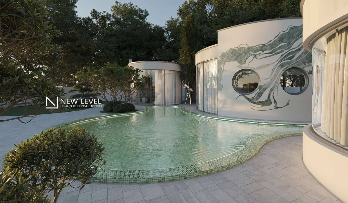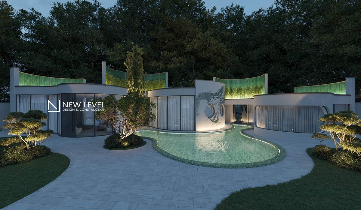 حجم دوم، که شامل اتاق خوابها و استخر است، به صورت معلق طراحی شده است. این انتخاب، علاوه بر ایجاد حس سبکی و شناوری در معماری، فضایی مدرن و منحصربهفرد به نما بخشیده است. حجم سوم که به آشپزخانه و فضای ناهارخوری اختصاص دارد، بهگونهای قرار گرفته که امکان دسترسی آسان به محیطهای داخلی و بیرونی را فراهم کند. این ترکیب احجام، فضایی پویا و چند لایه ایجاد کرده که زیبایی بصری و عملکردی را بهطور هم زمان ارائه میدهد.