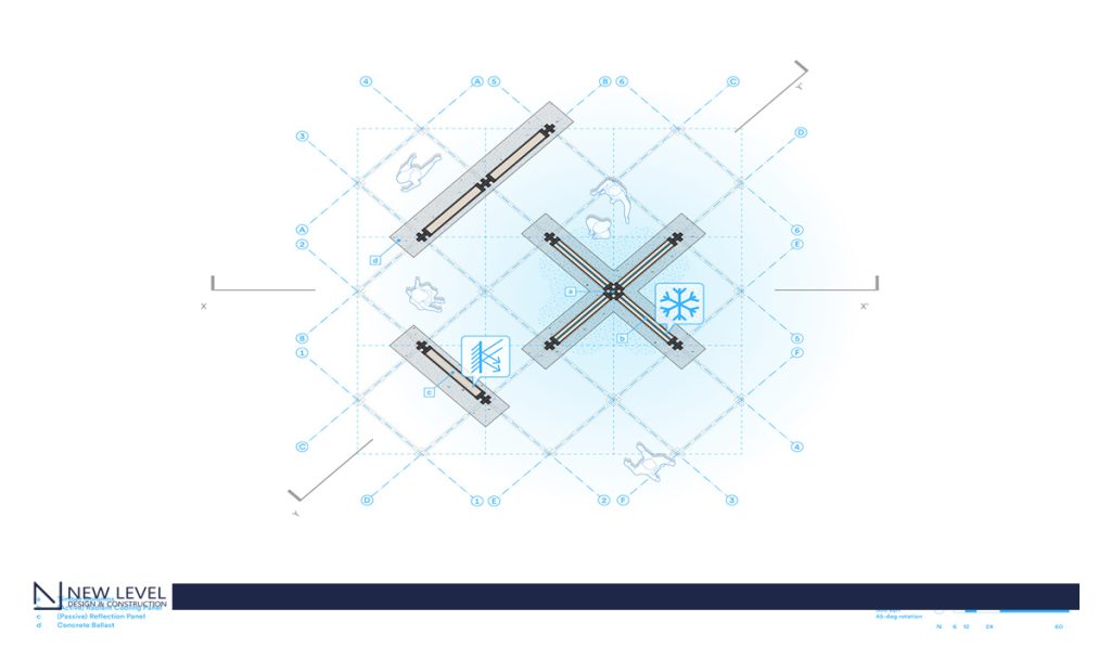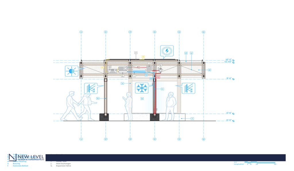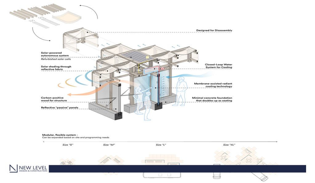 At the core of the initiative is membrane-assisted radiant cooling, an approach that replaces the mechanical reduction of air temperature with the direct cooling of the human body. The system uses panels with embedded microtubes that circulate chilled water, radiating coolness toward people and reducing thermal stress within minutes. “Research from our partners at the University of Pennsylvania shows that the panels start to cool your body within 5–7 minutes, when the effect becomes apparent, and by 20 minutes the cooling sensation is pronounced,” explains Kharbanda. To enhance performance, reflective mylar panels amplify the radiant effect, while a textile canopy provides shade and keeps the space permeable to natural ventilation. The main innovation, however, lies in the infrared-transparent protective membrane, which prevents condensation and ensures the system works even in hot and humid outdoor environments. Integrating this technology into a lightweight, mobile structure required close attention to materials and engineering: the panels were dimensioned to door-scale, maximizing surface area and, therefore, cooling efficiency.